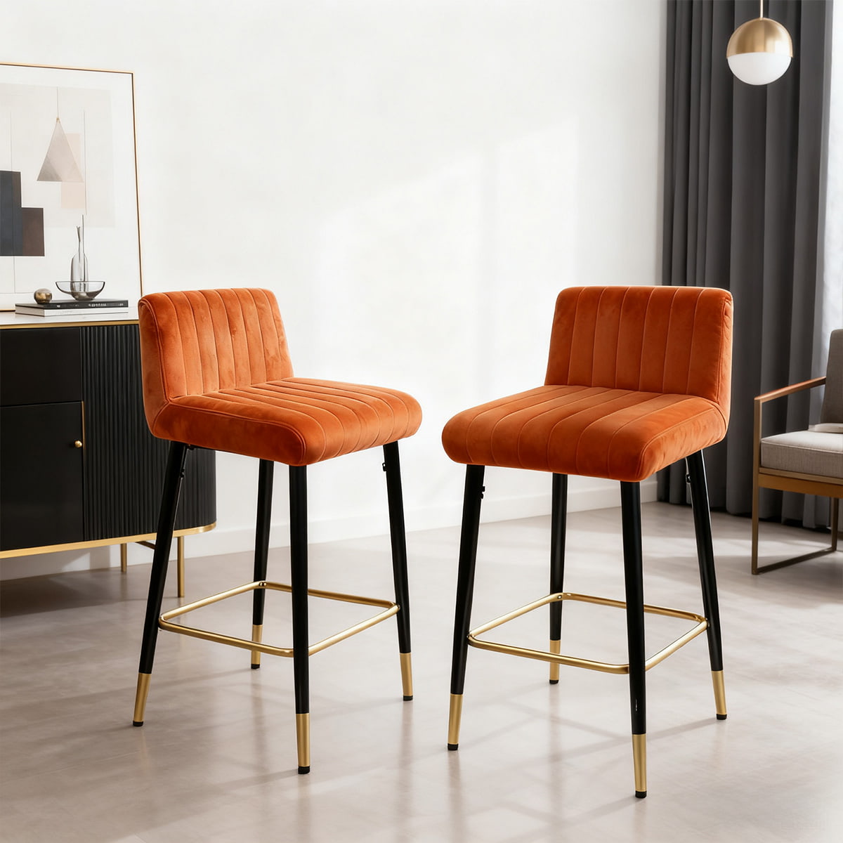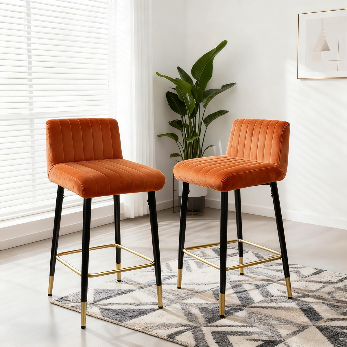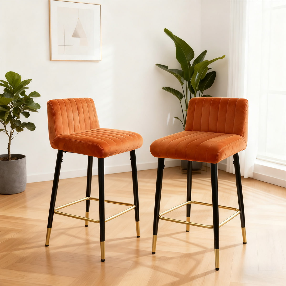 เก้าอี้สตูลบาร์กำมะหยี่สีส้มสีส้มสไตล์โมเดิร์น — เก้าอี้สูงเคาน์เตอร์หมุนได้ 360° พร้อมขาโลหะสีดำและสีทอง ที่นั่งบุนวมนุ่มและที่วางเท้าสำหรับเกาะห้องครัว บาร์ หรือห้องรับประทานอาหาร