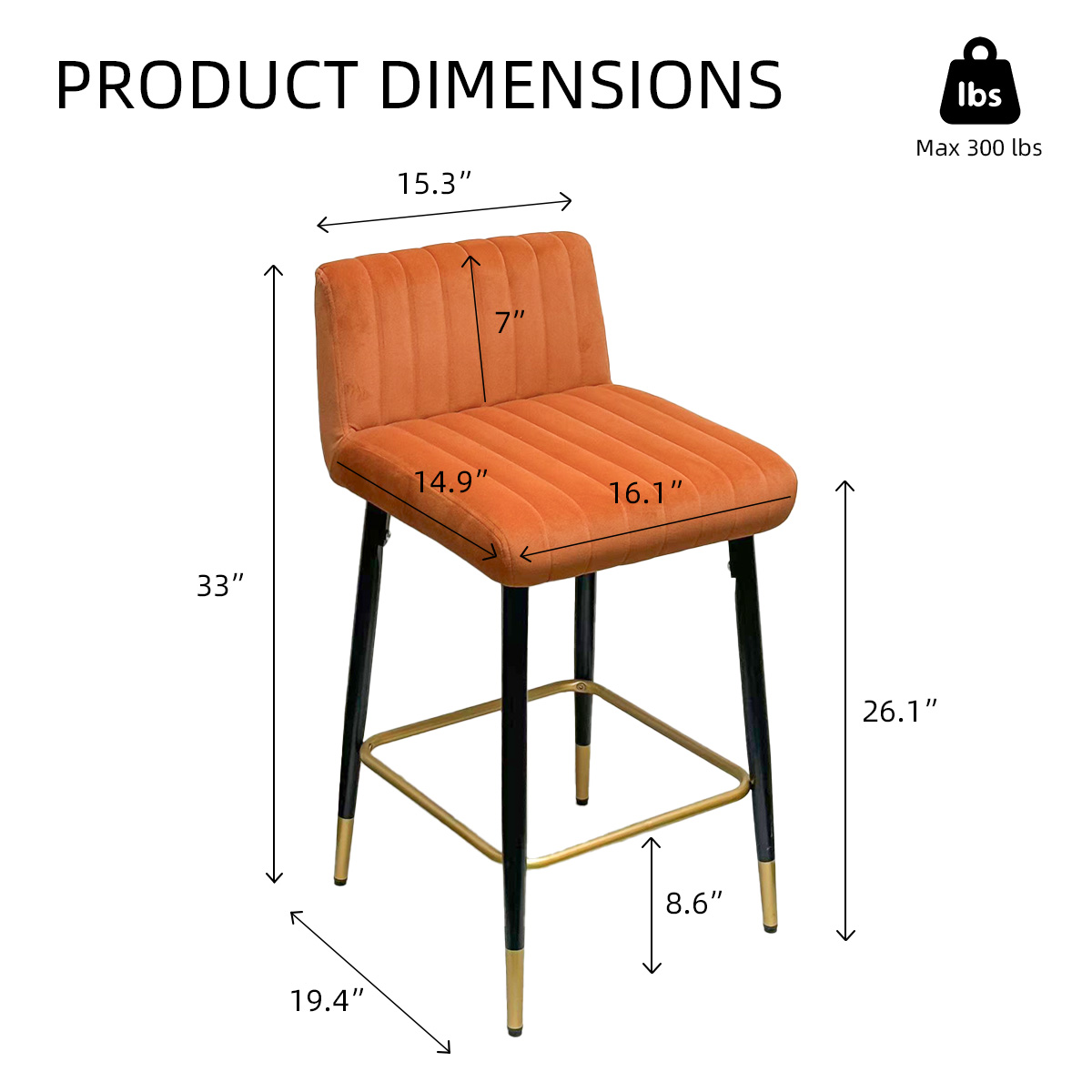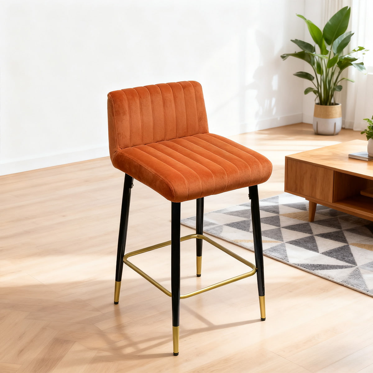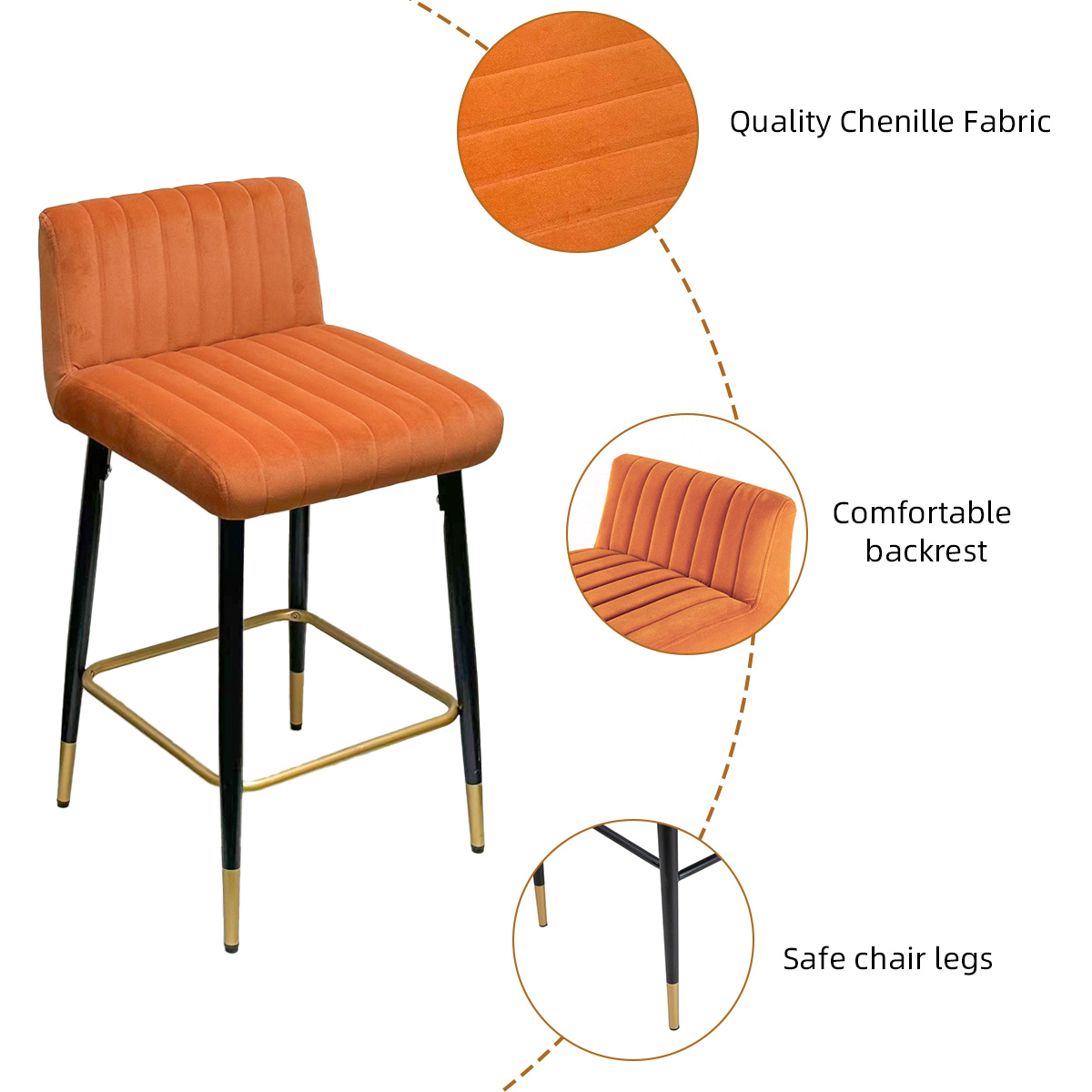 เก้าอี้สตูลบาร์กำมะหยี่สีส้มสีส้มสไตล์โมเดิร์น — เก้าอี้สูงเคาน์เตอร์หมุนได้ 360° พร้อมขาโลหะสีดำและสีทอง ที่นั่งบุนวมนุ่มและที่วางเท้าสำหรับเกาะห้องครัว บาร์ หรือห้องรับประทานอาหาร