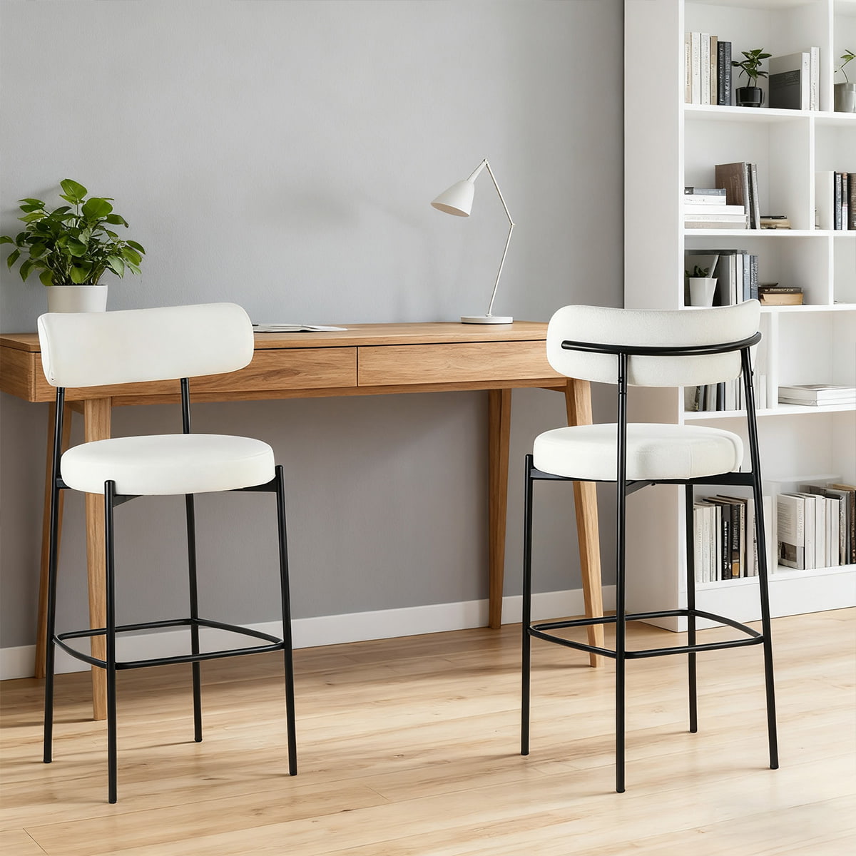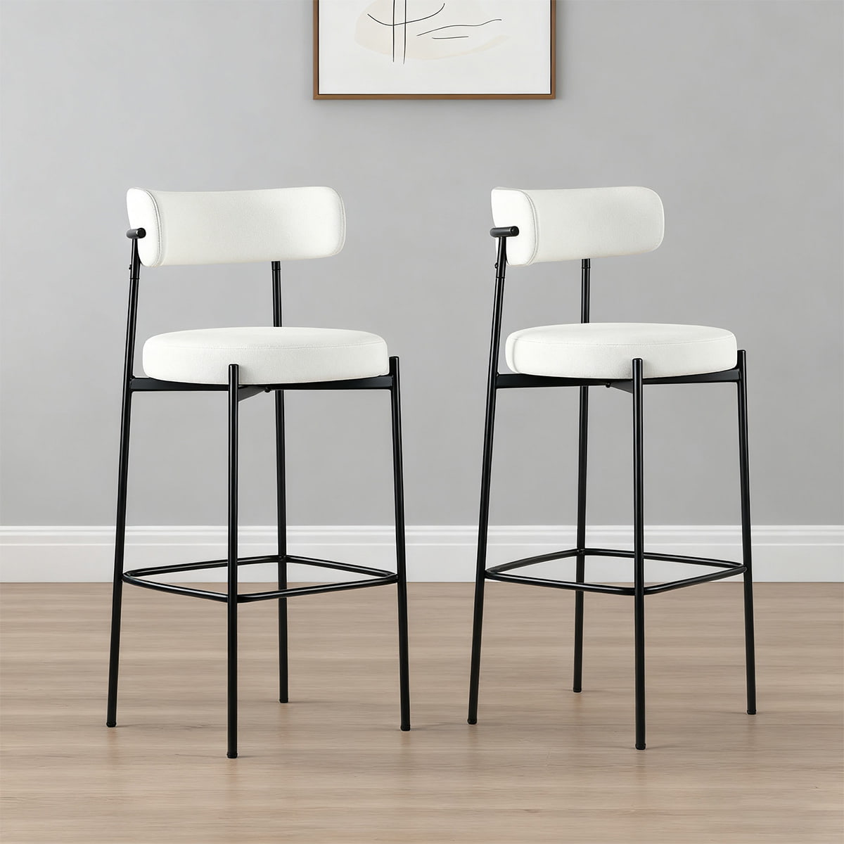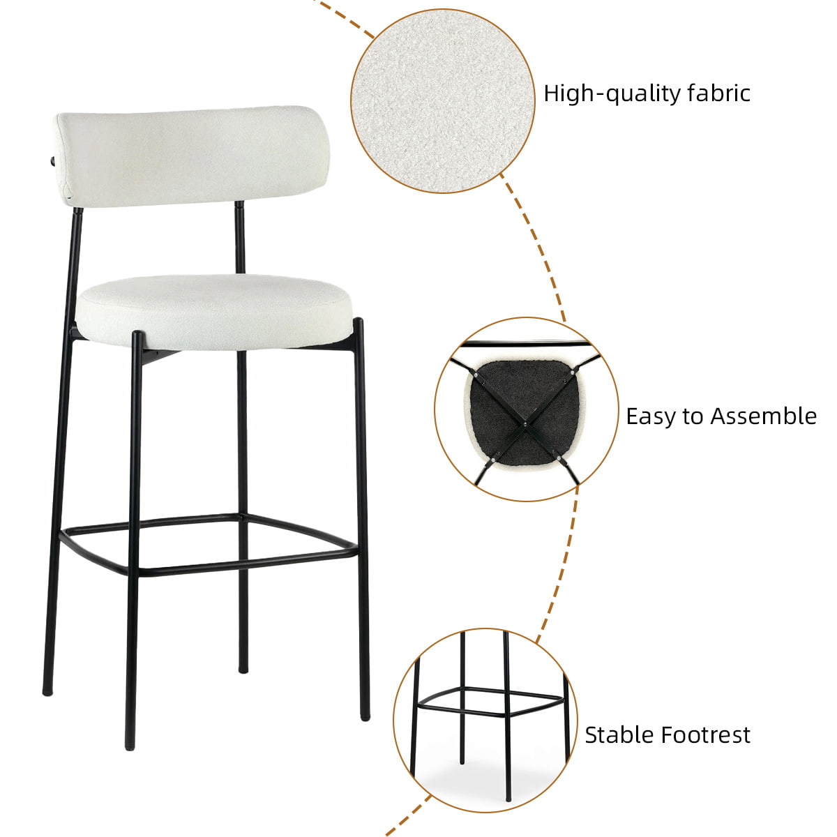 เก้าอี้สตูลบาร์Boucléสีขาวทันสมัยพร้อมขาโลหะสีดำ - เก้าอี้บาร์สูงหุ้มเบาะพร้อมพนักพิงและที่วางเท้าสำหรับเกาะห้องครัวห้องรับประทานอาหารและโฮมบาร์
