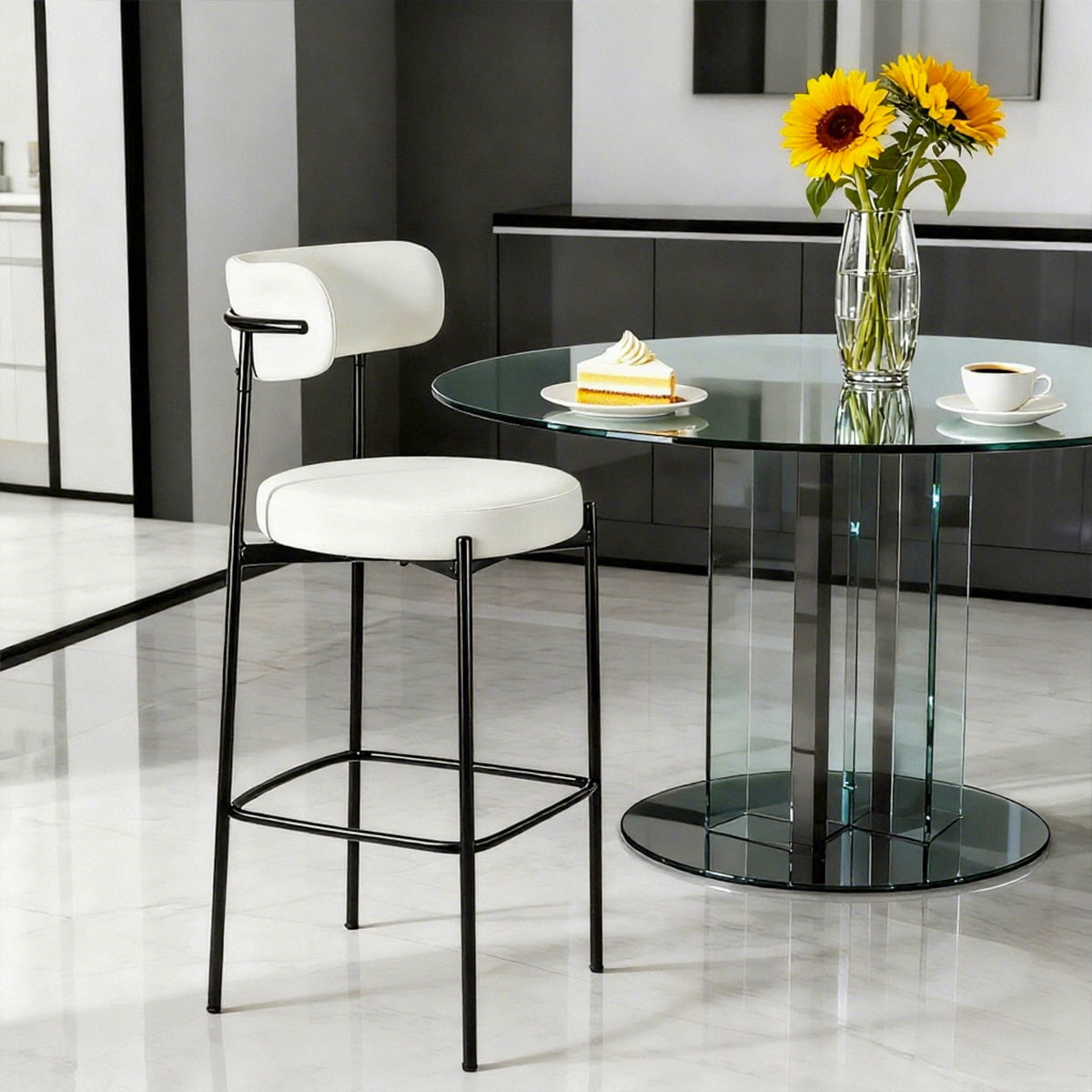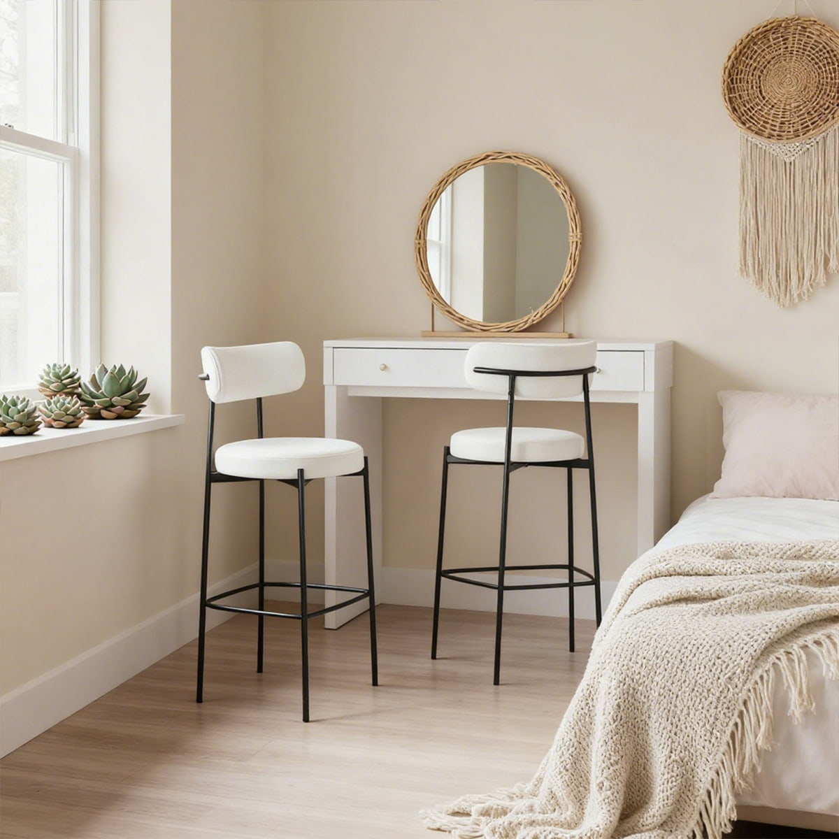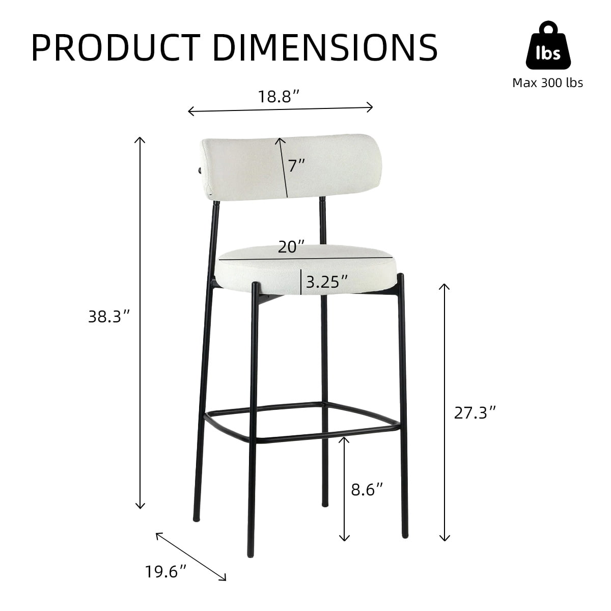เก้าอี้สตูลบาร์Boucléสีขาวทันสมัยพร้อมขาโลหะสีดำ - เก้าอี้บาร์สูงหุ้มเบาะพร้อมพนักพิงและที่วางเท้าสำหรับเกาะห้องครัวห้องรับประทานอาหารและโฮมบาร์