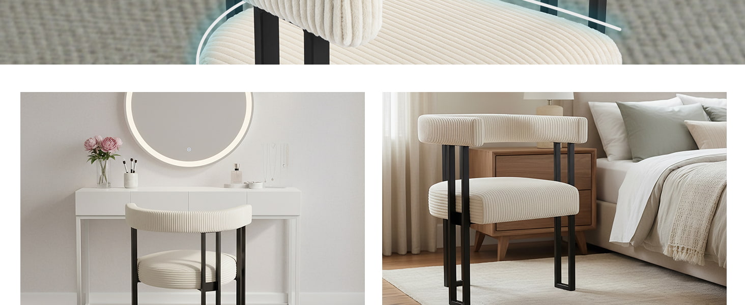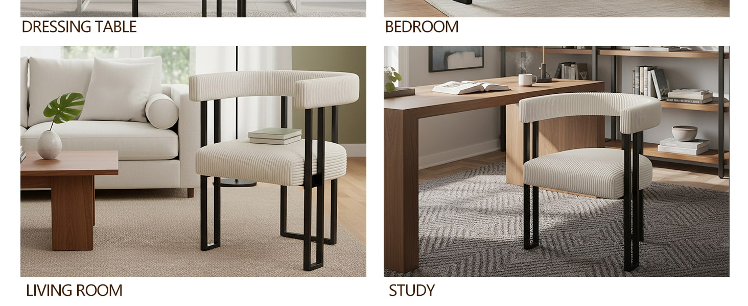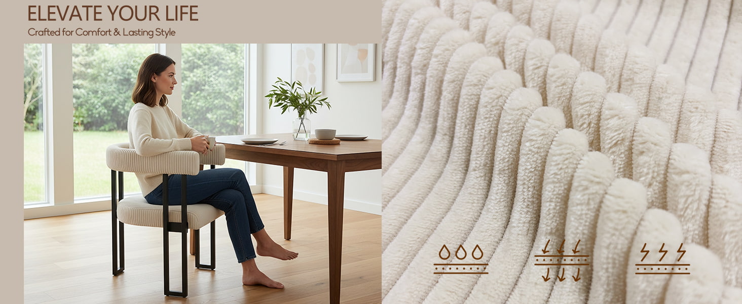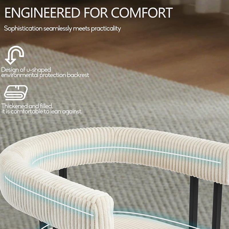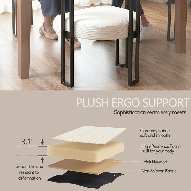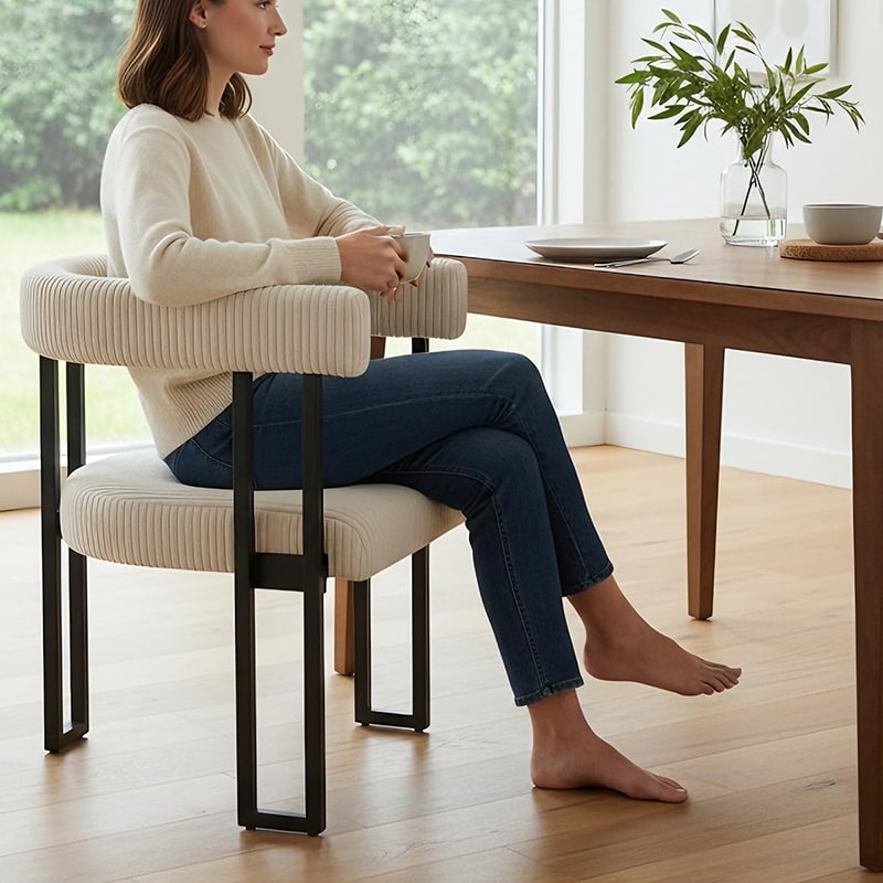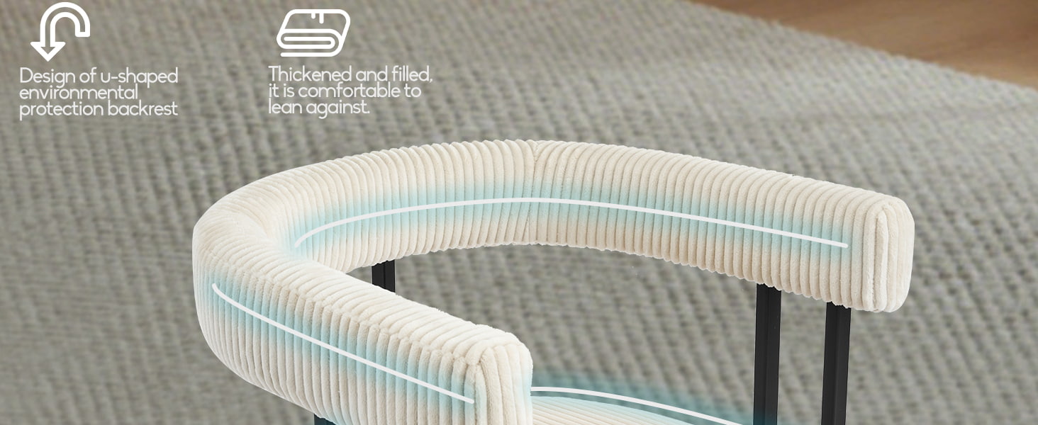 ที่นั่งหุ้มด้วยโฟมความยืดหยุ่นสูงซึ่งคงรูปทรงไว้เมื่อเวลาผ่านไป ให้การรองรับที่เชื่อถือได้ไม่ว่าจะใช้ที่โต๊ะรับประทานอาหาร โต๊ะเครื่องแป้ง หรือโต๊ะทำงานที่บ้าน พนักพิงรูปตัว U ที่ออกแบบอย่างพิถีพิถันให้การรองรับตามหลักสรีรศาสตร์สำหรับเอวและหลัง ช่วยลดความเมื่อยล้าระหว่างการนั่งเป็นเวลานาน