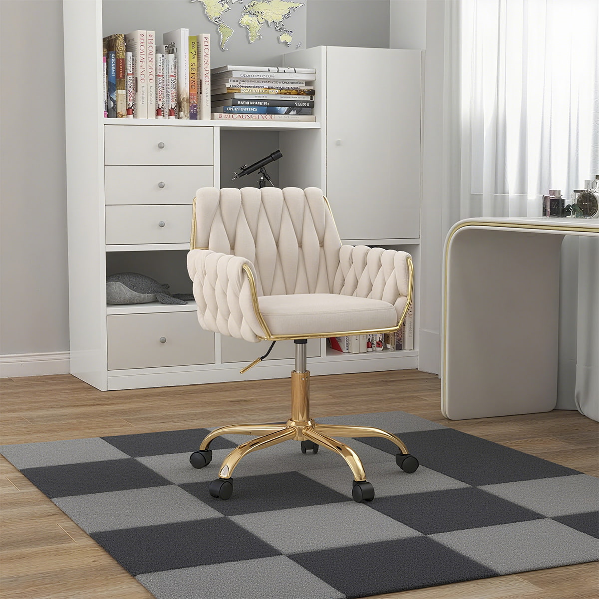 เก้าอี้โฮมออฟฟิศกำมะหยี่สีเบจ – เก้าอี้โต๊ะเครื่องแป้งปรับระดับได้ทันสมัยพร้อมฐานสีทอง พนักพิงและที่เท้าแขนทอด้วยมือ เก้าอี้โต๊ะกลิ้งหมุนได้ 360°