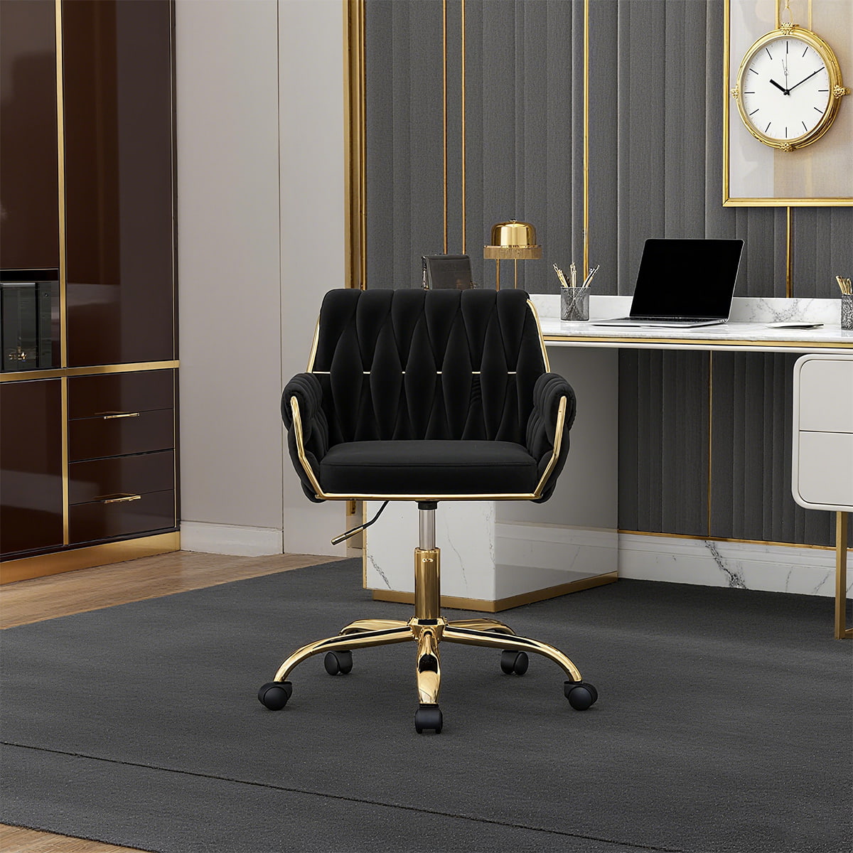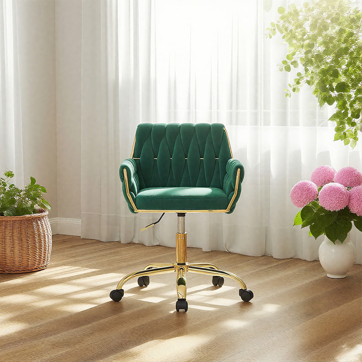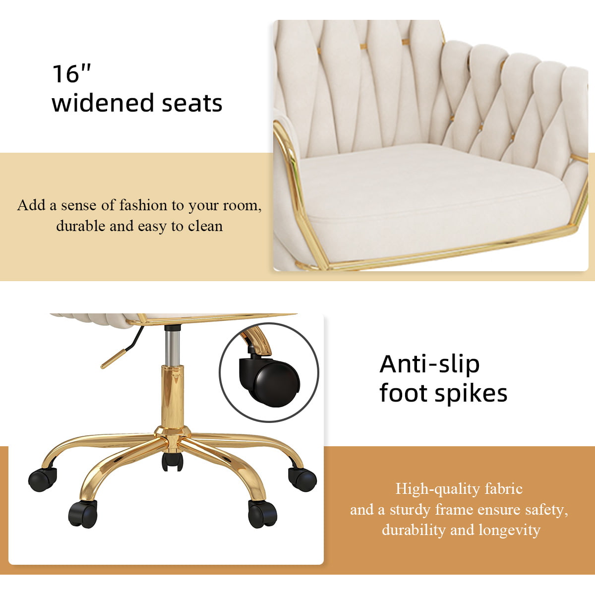 เก้าอี้สำนักงานกำมะหยี่สีเบจทันสมัยพร้อมฐานสีทองนี้เป็นเก้าอี้โต๊ะเครื่องแป้ง เก้าอี้โต๊ะทำงานที่บ้าน และเก้าอี้ล้อเลื่อนในห้องอ่านหนังสือในอุดมคติ โดดเด่นด้วยเบาะกำมะหยี่หรูหรา พนักพิงทอตามหลักสรีระศาสตร์ ที่วางแขนบุนวม และความสูงของเบาะนั่งแบบปรับได้ ช่วยให้มั่นใจได้ถึงความสบายตลอดทั้งวันพร้อมทั้งเสริมการตกแต่งภายในของคุณ ฐานหมุนได้ 360° พร้อมล้อเลื่อนเรียบ ทำให้ใช้งานได้อเนกประสงค์สำหรับทำงาน แต่งหน้า อ่านหนังสือ หรือเล่นเกม