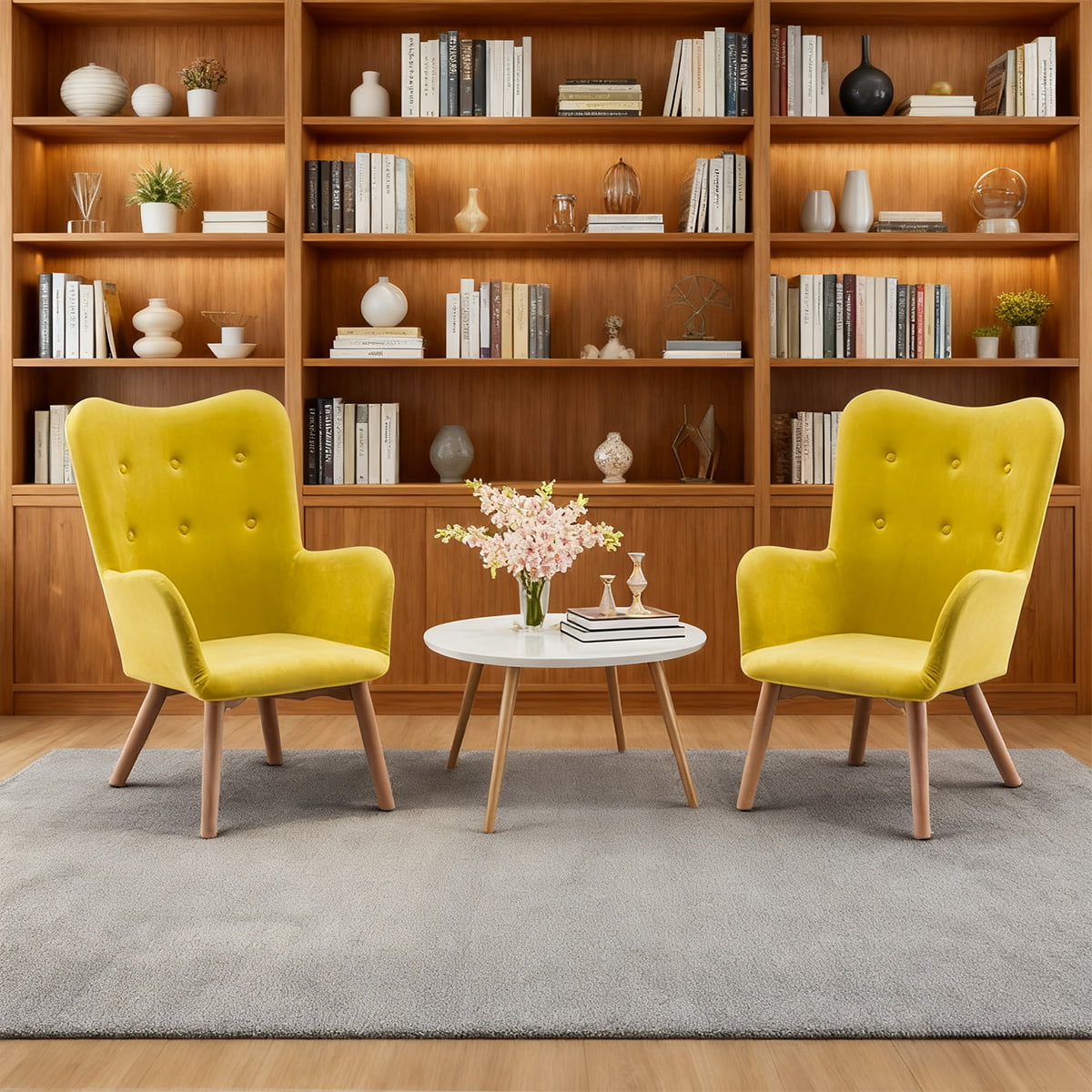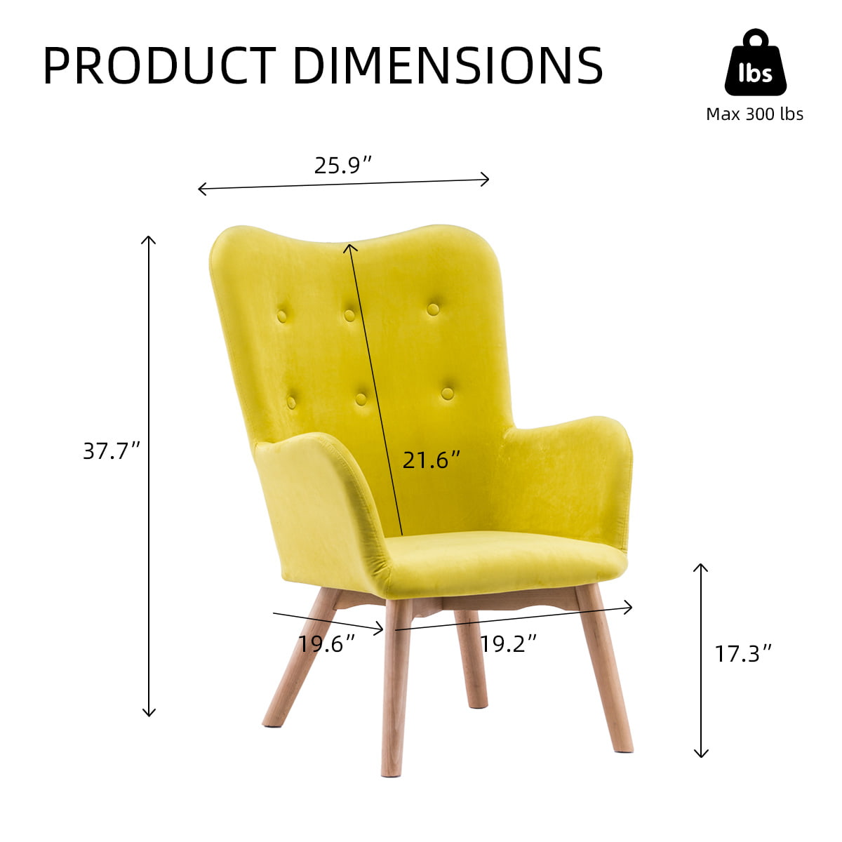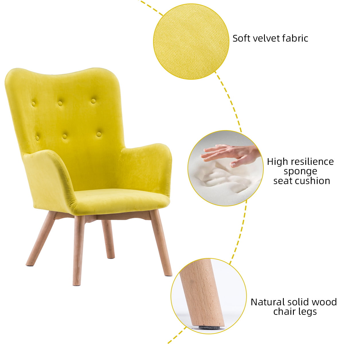 เก้าอี้นวมกำมะหยี่สีเหลืองทันสมัย - เก้าอี้พักผ่อนแบบมีปีกหลังพร้อมขาไม้และที่วางแขนสำหรับห้องนั่งเล่นห้องนอนหรือสำนักงาน